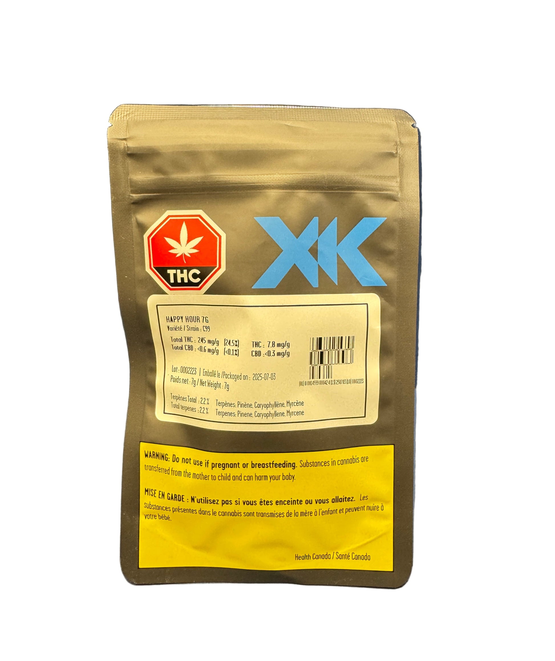 Happy Hour is a sativa-leaning hybrid cross of Wedding Cake and Thin Mint, delivering dense, visually striking buds with green coloration and purple undertones. A thick trichome layer coats the flower, signaling potency and quality. The strain's sweet, minty aroma reflects its parentage, creating a distinctive sensory profile. This 7g offering provides ample quantity for extended exploration of the hybrid's balanced effects.