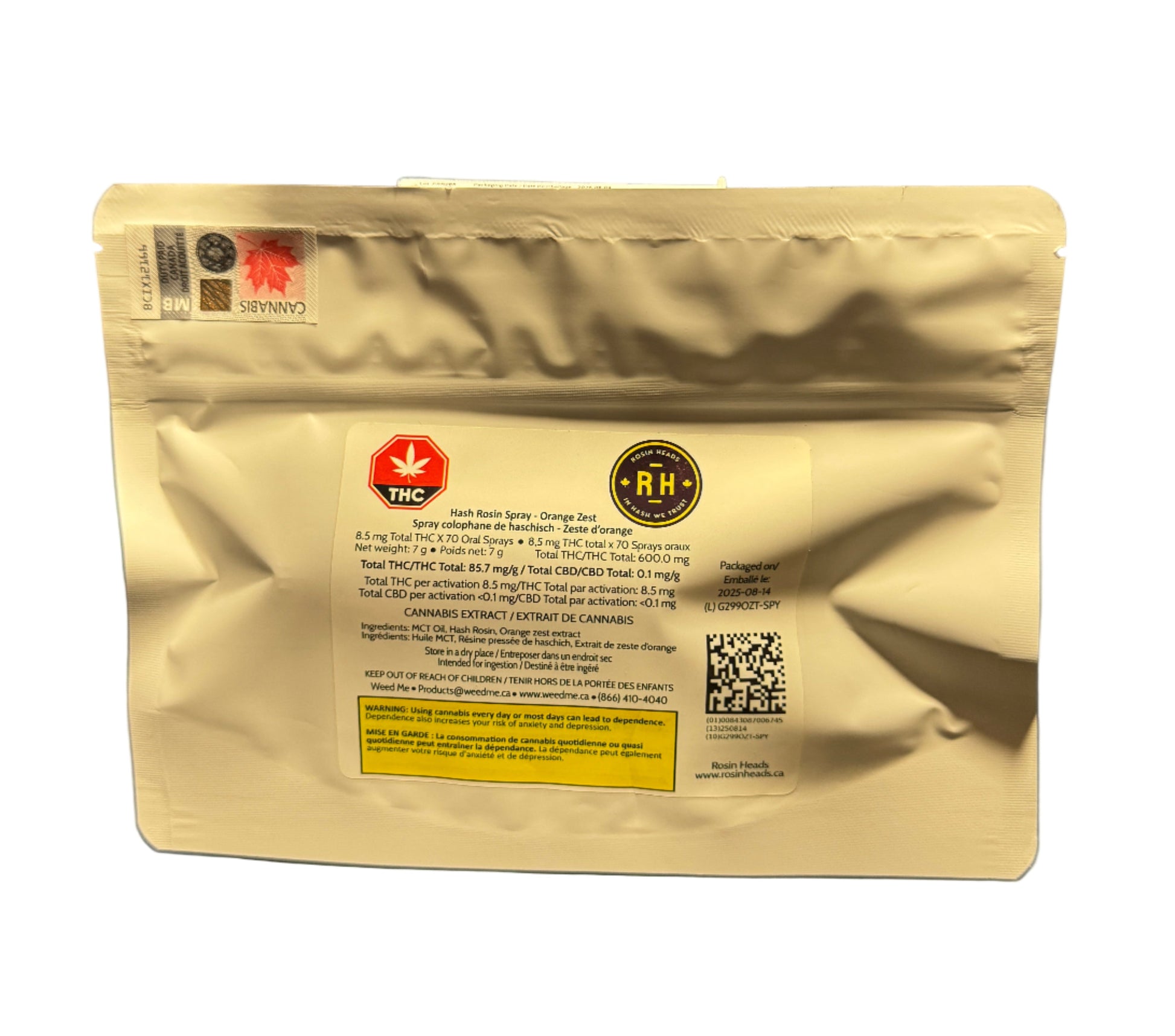 Orange Zest Hash Rosin Spray delivers solventless, full-spectrum cannabis in a portable, precision-dosed format. Each bottle contains approximately 70 sprays, offering consistent microdosing control for on-the-go or home use. Mild citrus notes complement the natural terpene profile without masking the plant's authentic character. This clean extraction method preserves cannabinoid and terpene integrity, making it ideal for users prioritizing purity, convenience, and accurate dosing in a discreet spray application.
