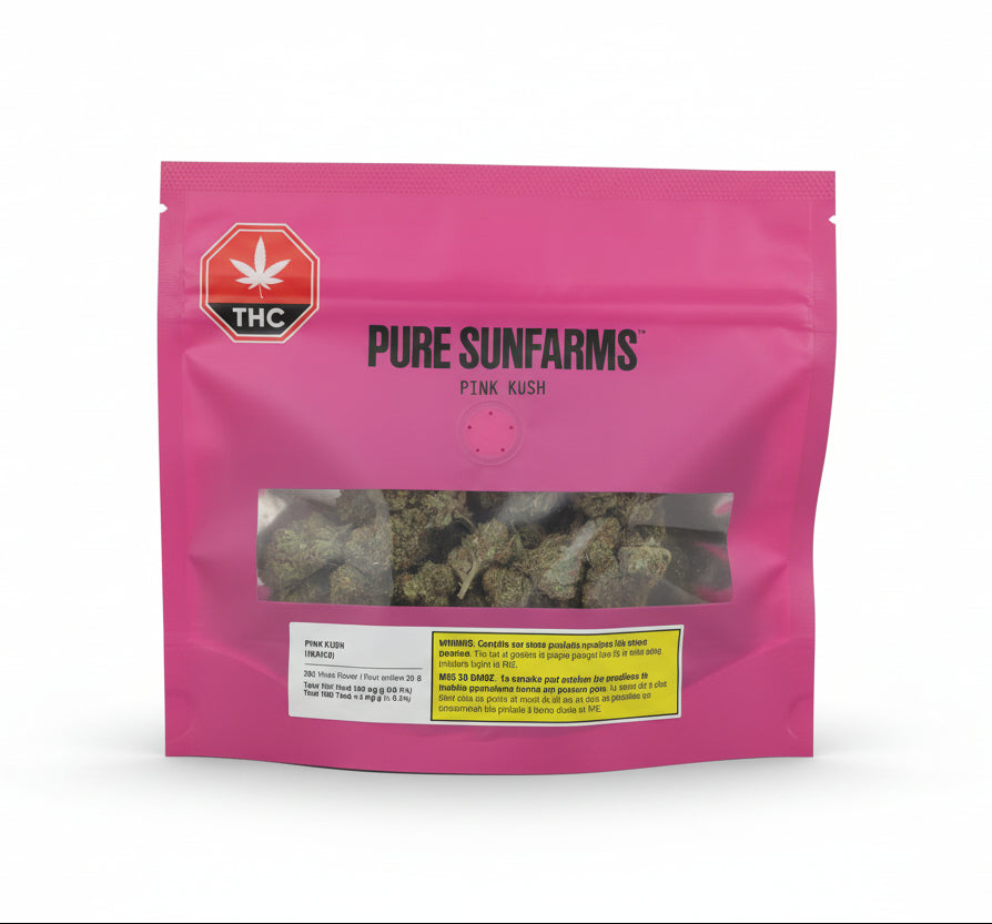 Pure Sunfarms' Pink Kush represents a distinguished Vancouver Island expression of the OG Kush lineage, prized across Canada for its potent aromatic complexity and visual appeal. Dense, round buds display forest-green foliage with purple undertones, crowned by dark amber pistils and a thick trichome layer. Cultivated in the Fraser Valley's advanced greenhouse environment, each flower undergoes meticulous hand-trimming, grooming, drying, and curing. The terpene profile???????anchored by caryophyllene, myrcene, humulene, bisabolol, and limonene???????yields a sophisticated gassy character with notes of white pepper, orange, butterscotch, coffee, earth, and grapefruit.